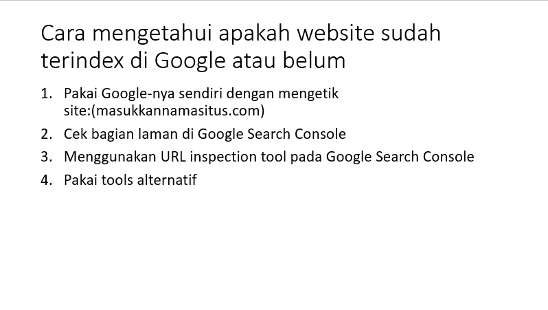 Jadi, ada beberapa cara untuk mengetahui apakah website kita sudah terindex di Google atau belum. Berikut caranya: