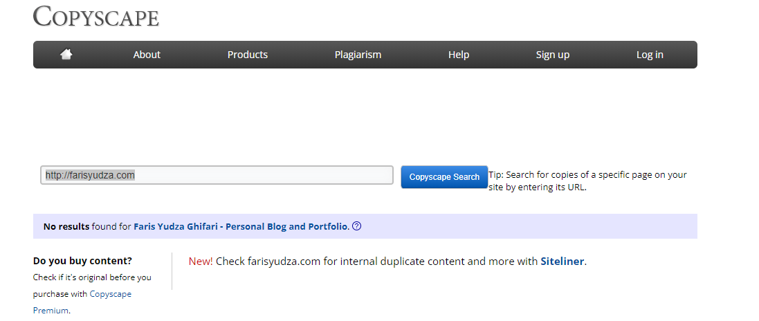Copyscape bisa melihat apakah ada tulisan tiruan/plagiarisme, bahkan sampai sumber tulisan yang diplagiat.