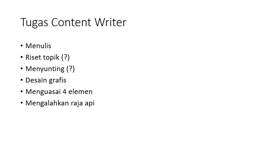 Menurut opini penulis, sebaiknya tolaklah “palu gada” jika kamu mendapatkan pekerjaan di luar tugas content writer, apalagi jika sudah jauh keluar dari job description-nya.