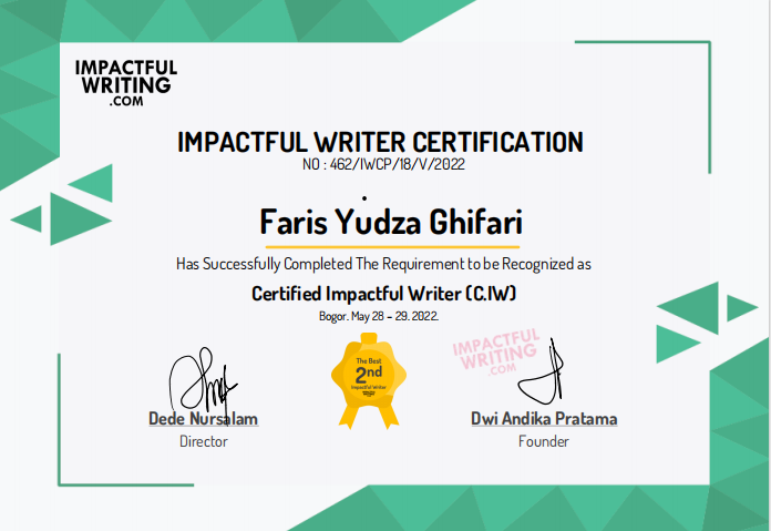 Penulis sendiri pernah mengikuti certified impactful writer dan berhasil lulus sebagai penulis terbaik kedua pada program tersebut.
