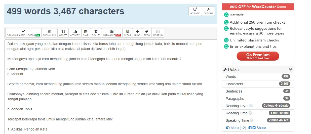Selain jumlah kata, ada juga jumlah karakter, paragraf, estimated reading time, estimated speaking time, readibility, dan keyword density. Mirip dengan Yoast, namun fitur utamanya tetap untuk menghitung jumlah kata.