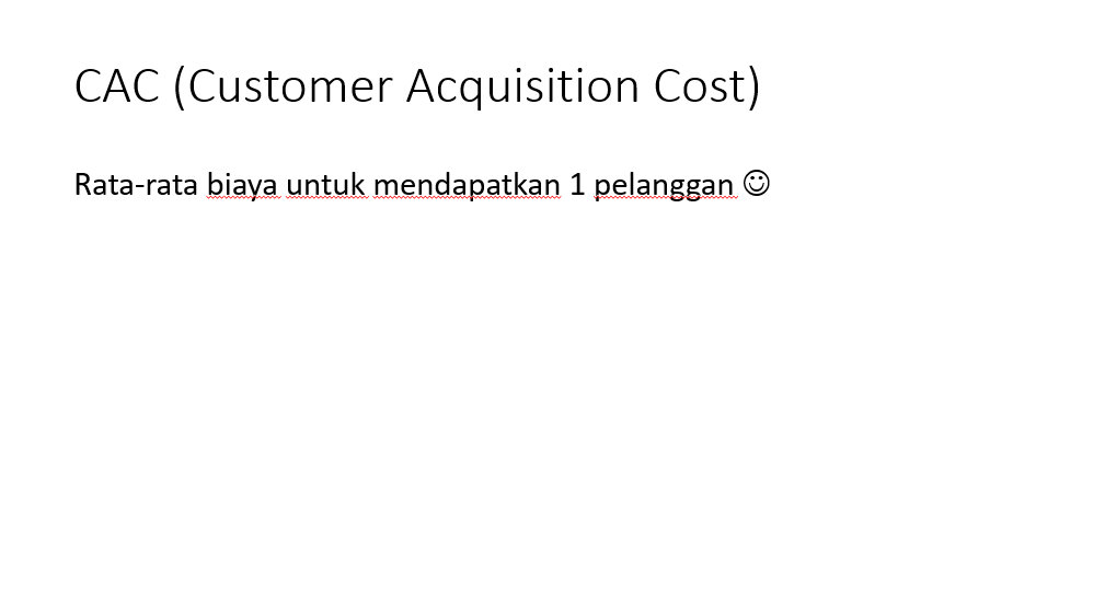 CAC (rupiah/pelanggan) = jumlah budget marketing yang dikeluarkan/jumlah pelanggan yang didapatkan.