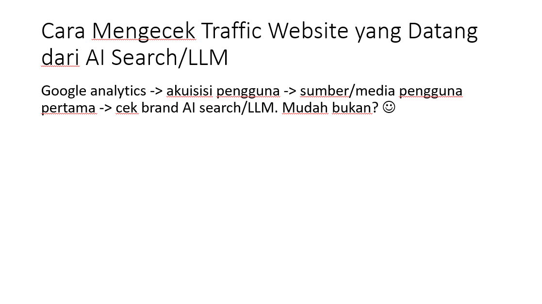 Dengan pengguna AI search/LLM semakin meningkat, maka pengecekan traffic berkala dari kanal tersebut juga sebaiknya dipantau. Jika traffic dari sana masih terlalu sedikit, kemungkinan optimasi GEO yang kamu lakukan belum optimal atau brand-mu belum cukup dikenal, bahkan mesin tidak mau merekomendasikannya. Bisa juga brand-mu tidak menarik untuk diklik saat AI menyitasi situsmu.