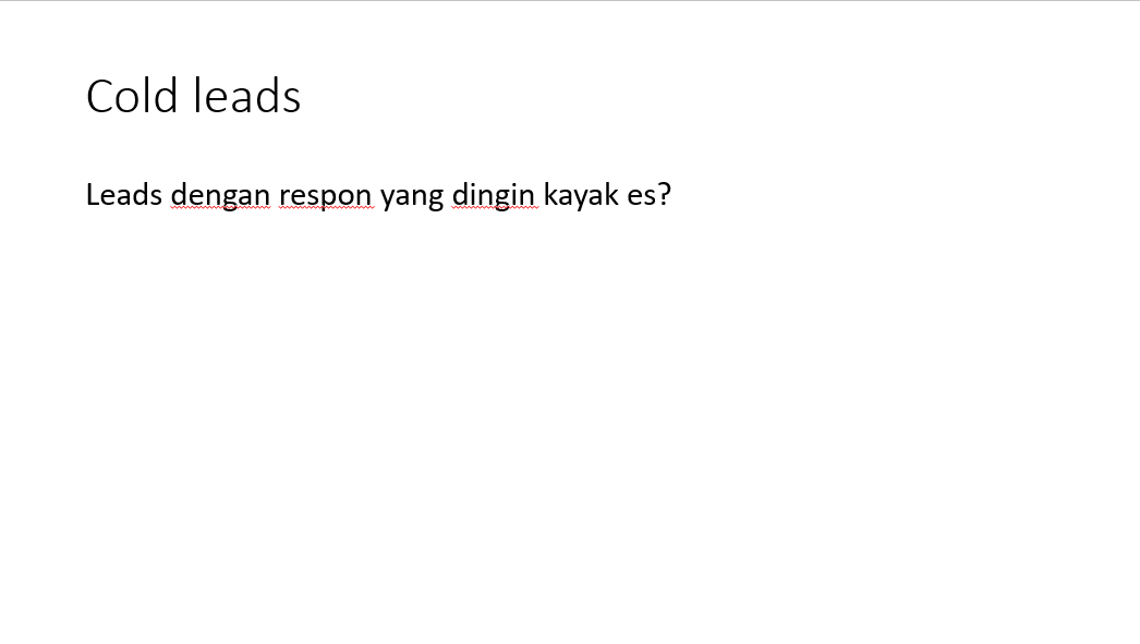Cold leads adalah prospek yang sama sekali tidak menunjukkan ketertarikan kepada produk/jasa bisnismu. Kalau pun tertarik ya paling hanya sedikit saja dan sekedar tanya-tanya tanpa antusiasme.