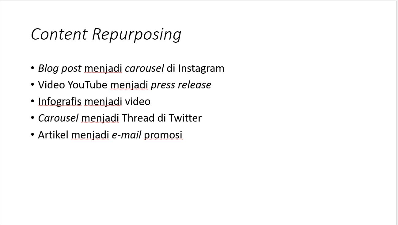 Apakah kamu pernah mendengar tentang content repurposing? Misalnya, dari blog post-mu yang format utamanya adalah tulisan, diolah lagi oleh desainer grafis untuk membuat carousel atau infografis di media sosial.