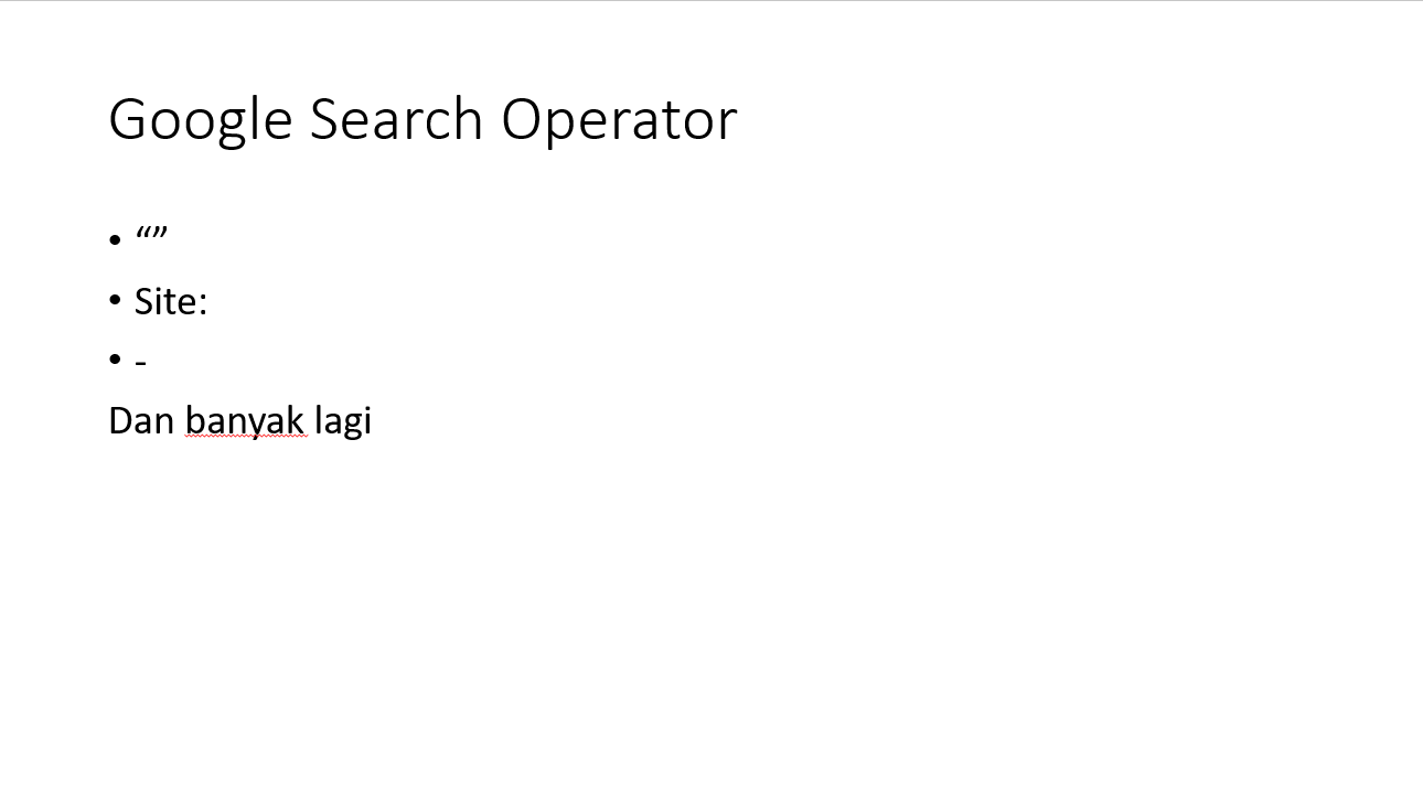 Googling juga adalah sebuah skill. Jadi, kuasailah cara menggunakan Google search operator agar menemukan informasi yang kita inginkan. Contohnya, kalau lagi cedera, kita bisa pakai “penanganan cedera” atau “pengobatan cedera”. Bagi peneliti yang ingin membuat systematic literature review, operator “” bermanfaat untuk screening dan filtering. Praktisi SEO juga bisa menggunakan operator site: untuk mengetahui berapa laman yang terindeks.