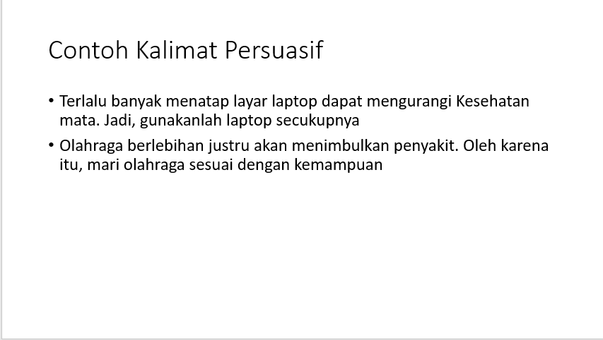 Kalimat persuasif ini tidak hanya kita temukan dalam kehidupan sehari-hari, tetapi juga di berbagai bidang seperti periklanan dan pendidikan.