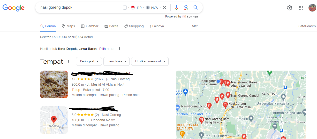 Saat googling untuk cari makanan karena lapar. Biasanya kita memasukkan kueri seperti nasi goreng. Kemudian, hasil dari SERP-nya akan menunjukkan Google maps dan restoran yang kira-kira paling dekat dan punya review yang bagus. Nah, restoran yang tercantum di SERP tersebut sebenarnya telah berhasil memanfaatkan local SEO.