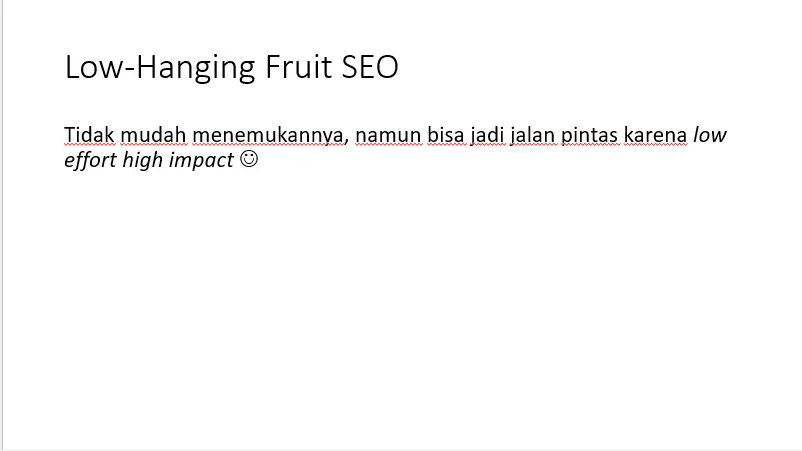 Low-hanging fruit pastinya adalah keinginan banyak orang termasuk digital marketer seperti SEO. Mau bagaimana pun, terdapat tenggang waktu bagi pekerjaan SEO, sehingga low-hanging fruit bisa memberikan hasil yang cepat dan membantu dalam mencapai KPI/OKR, baik itu jangka pendek atau pun jangka panjang.