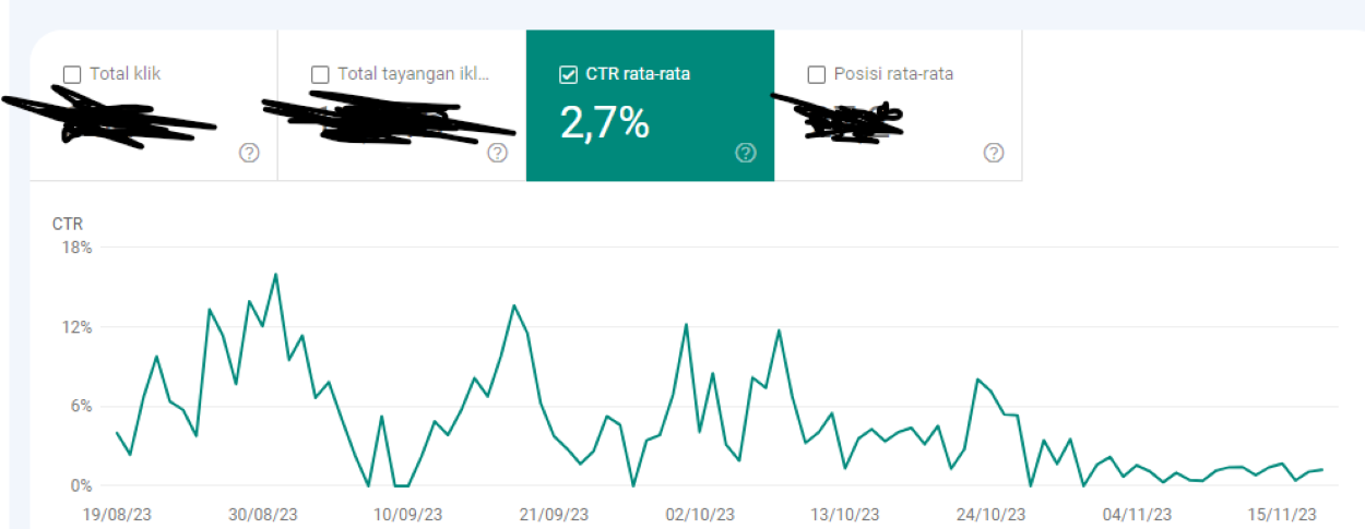 Di Google Search Console, klik performance. Lalu, di samping kanan impresi (kotak warna ungu), ada CTR situsmu.