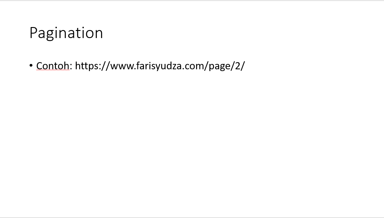 Dalam pagination sekalipun, struktur URL yang jelas juga adalah kewajiban. Contohnya: https://www.farisyudza.com/page/2/ jelas bahwa ini merupakan page 2. Sebaiknya tidak memakai rel=prev/next.