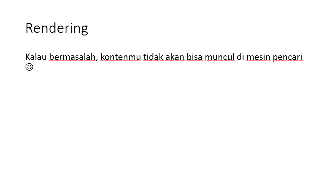 Katakan kalian punya website, dan file yang bisa dirender oleh GoogleBOT hanya JS yang berfungsi untuk mengatur action atau respon dari sebuah halaman. Karena hanya berisi kumpulan action, GoogleBOT tidak menemukan konten yang bermanfaat.