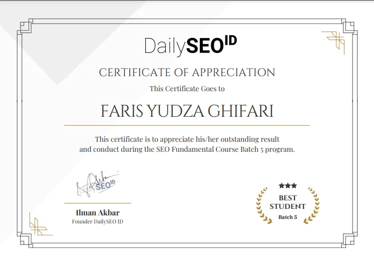 SEO Fundamental Course dari DailySEO ID memiliki ini. Kebetulan penulis mendapatkan predikat best student di course ini dan ada sertifikat khususnya.