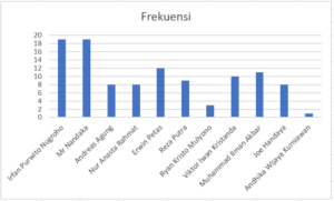 Dari diagram batang (statistik deskriptif), Irfan Purwito Nugroho dan Mr Nandaka selalu muncul di setiap output prompt-nya.