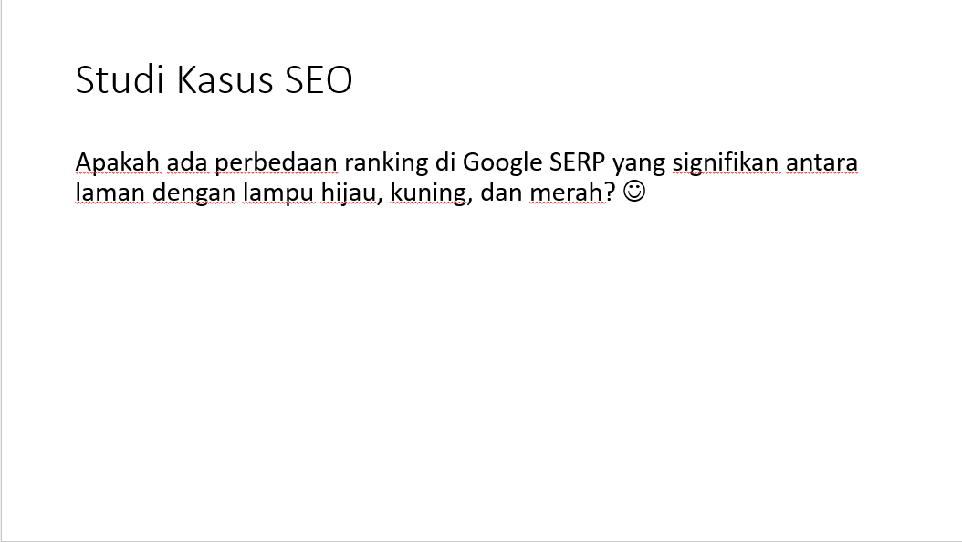 Mungkin kita sudah tidak asing dengan mitos SEO seperti Yoast harus lampu hijau kalau mau ranking-nya bagus di Google SERP. Yah, sebenarnya itu mitos. Namun, bagaimana kalau kita coba riset secara kuantitatif? Apakah secara statistik inferens ada perbedaan signifikan pada ranking dengan halaman skor lampu hijau, kuning, dan merah?